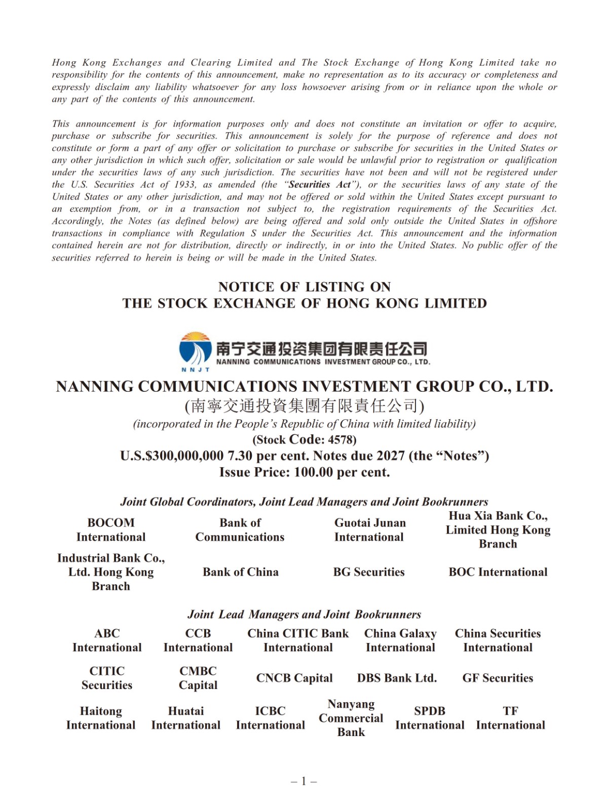 Nanning Communications Investment Group Co., Ltd.(南寧交通投資集團有限責(zé)任公司) - U.S.$300,000,000 7.30 per cent. Notes due 2027